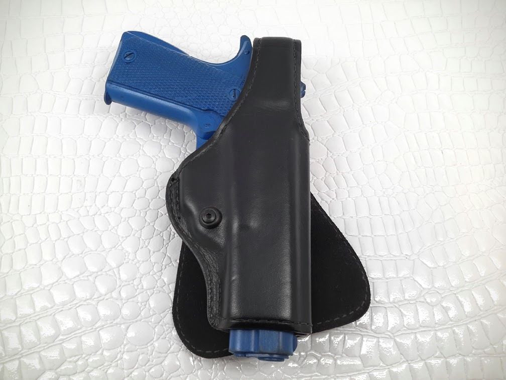 Suede-lined, custom formed thumb break makes this holster comfortable and lightweight. Medium to high ride design and adjustable tensioning device provide excellent handgun retention. Can be worn with virtually any standard-width belt or directly on the waistband.