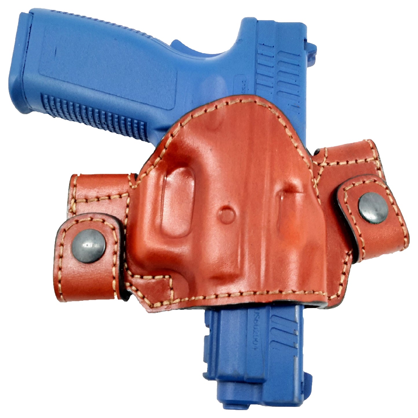 The term "Snap On Leather Open Top Holster" typically refers to a type of gun holster made of leather that features an open top and utilizes a snap button for retention. This type of holster allows for quick and easy access to the firearm while providing a level of security through the snap closure.