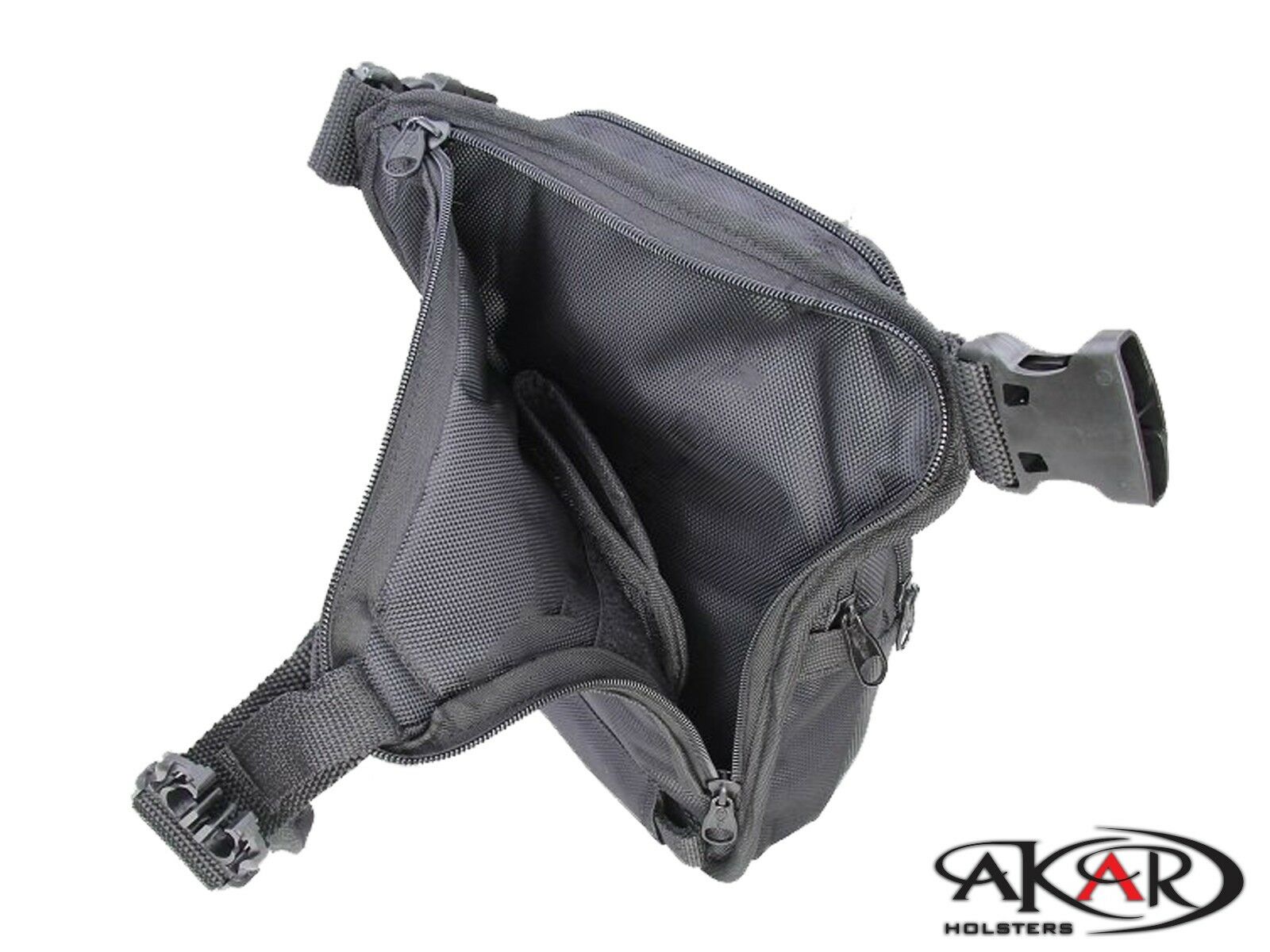 This bag is designed for concealed gun carry and it is suitable for right-hand users. It attaches to the belt and thigh with straps. The anti-slip material is used on the back to ensure the bag does not move on thigh. It features a large compartment and two front zipped pockets. Gun compartment has a zip opening to ensure a quick and easy draw and it includes an adjustable holder that allows carrying a gun with tactical light too.